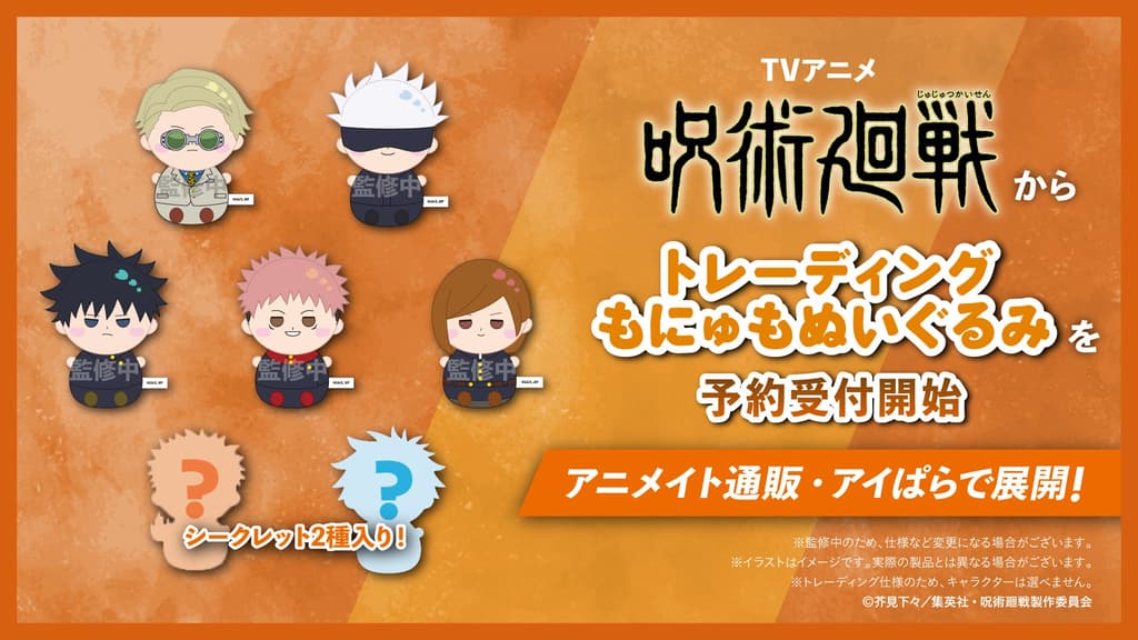 I-Goods Co., Ltd.(总部:东京涩谷),专门从事原创商品企划和生产,已于2025年8月下旬开始接受《咒术回战》交易“Monyumonu”毛绒公仔的预订。这些可爱的收藏品可在Animate指定商店和公司EC网站“I-para”上购买。