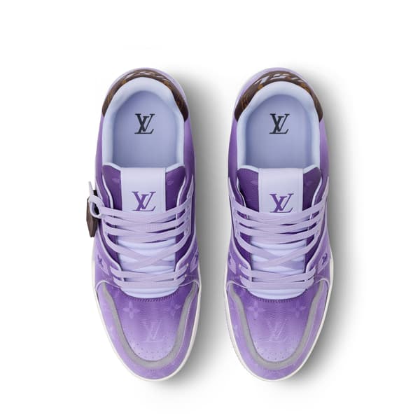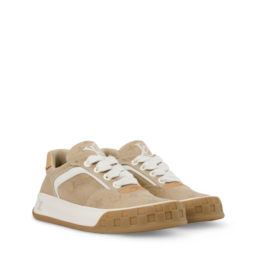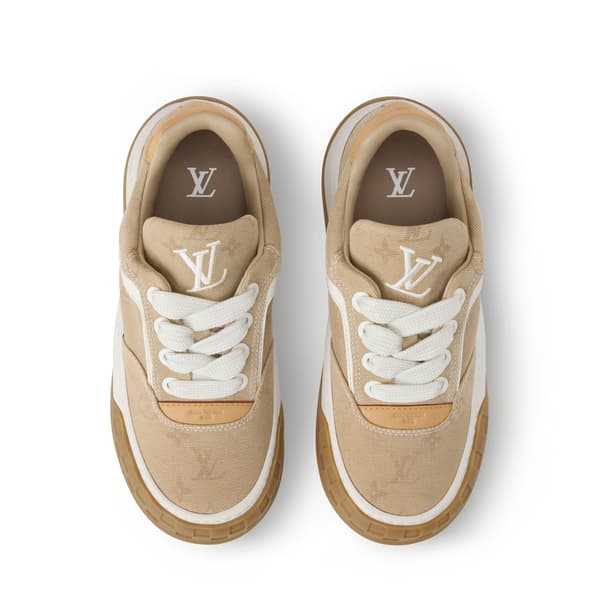 “LV Tilted运动鞋”采用精致的Monogram图案牛仔面料。品牌标志性的天然皮革饰边增强了设计感,灵感源自21世纪初的运动鞋。这款鞋以装饰鞋舌和外底的倾斜LV首字母签名命名,外底正面饰有Damier图案。