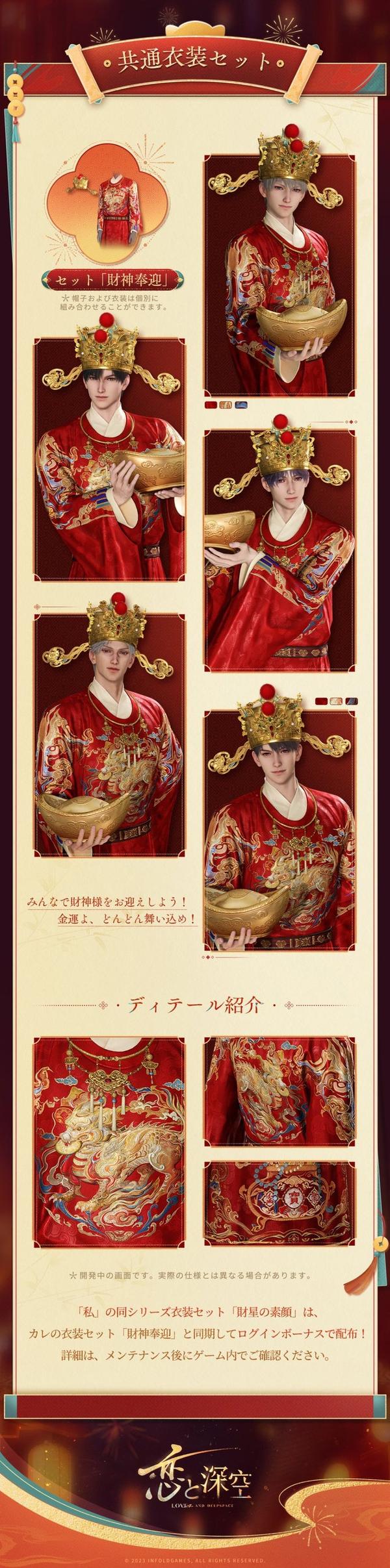 活动详情: 活动期间,累计登录10天,玩家可免费获得深空心愿券 x10、深空回响心愿券 x10、角色和“你”的财神服装套装、动态照片姿势 x2,以及各种道具奖励。
