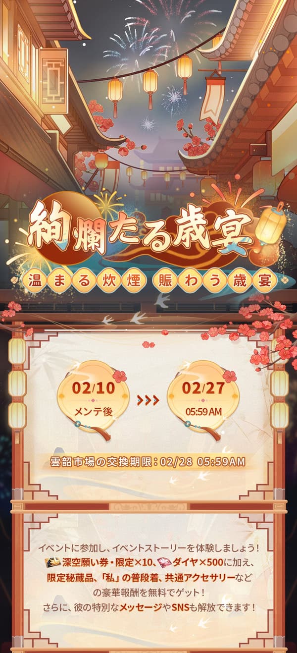 活动详情: 一场充满财富和繁荣的绚烂新年宴会!通过参与活动,玩家可以免费获得各种奖励,包括深空心愿券 - 限定 x10、钻石 x500、限定珍宝、“你”的日常服装风留下的痕迹、普通饰品和限定称号。角色的特别消息和社交媒体帖子也将解锁!