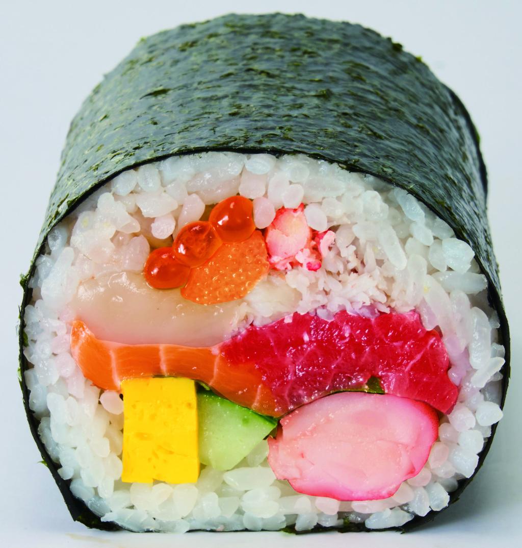 北海道扇贝、北海道鲑鱼、蓝鳍金枪鱼、虾、鲑鱼籽、鲱鱼籽、鸡蛋卷、雪蟹、黄瓜、紫苏叶