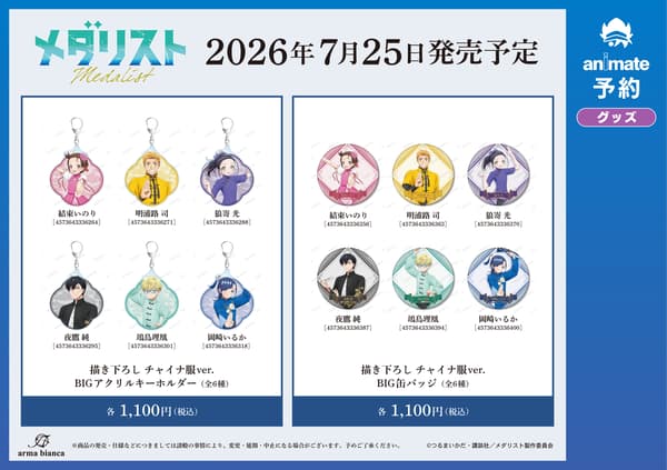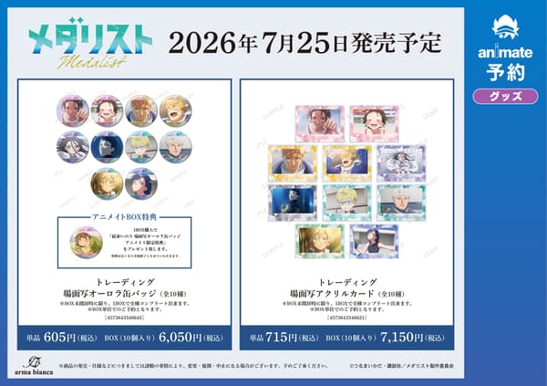 在网上预购期间(2026年4月23日至5月10日),在Animate网上商店预购指定《奖牌得主》角色商品,每满1,100日元(含税)即可获赠“明信片(共6种)”一张。