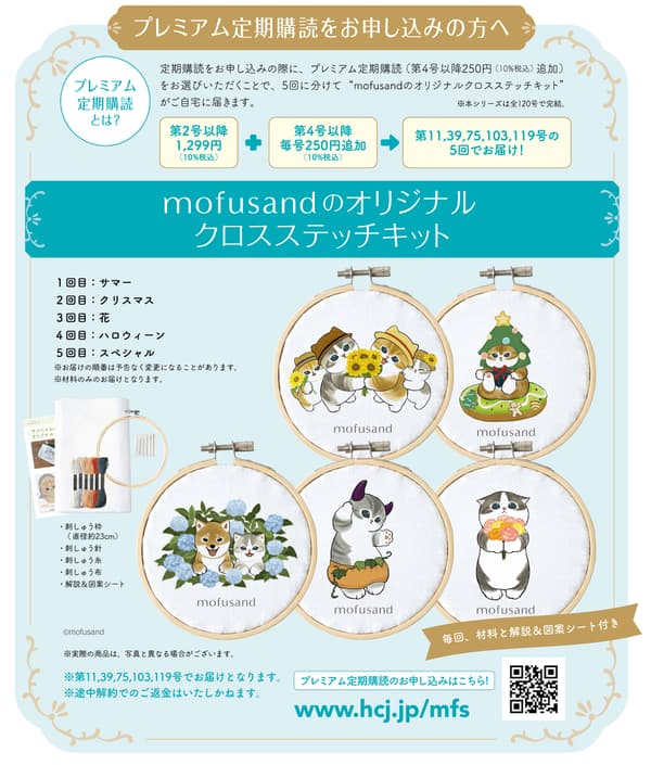 高级订阅包括分五次运送的 Mofusand 原创十字绣套装。