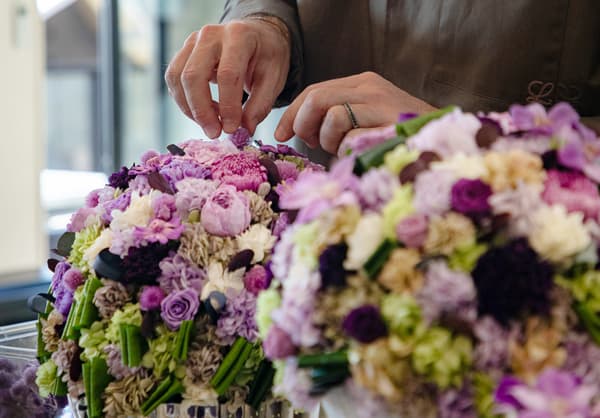 每一件作品都通过细致的手工制作而成:单独的绣球花一朵一朵地用线连接起来,叶子卷成环状,用镊子放置,其他精细的细节也得到了细致的处理。这种精湛的工艺赋予了保鲜花鲜花的活力。大约80%的生产过程是在东京工作室作为准备工作进行的,最后的润饰设计在现场完成,以适应每个单独的空间。