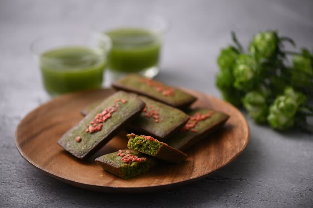 水果费南雪(抹茶)是一种源自法国的糕点,形状像金条——“financier”一词在法语中本身就意味着金融家或银行家。面团由西班牙杏仁粉和发酵黄油制成,并加入了静冈县产的天空抹茶®。草莓碎块散布其中,创造出香气和清爽甜味的平衡。