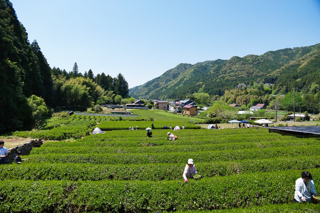 位于爱知县冈崎市中金町山间的茶园正在举办春季采茶活动。由石塚彩夏领导的“燕与茶田”(Tsubame to Chatake)采用自然农法,邀请参与者在风景如画的里山(日本乡村田园风光)背景下采摘鲜嫩的茶叶。