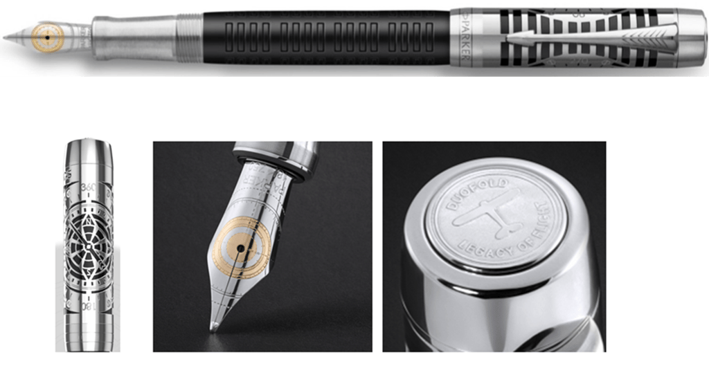 双色笔尖采用 18k 金和铑镀层,表达了航空罗盘的精确性和准确性。笔帽顶端饰有 PARKER 于 1928 年首次购买的 Fairchild 单翼飞机的图案。黑色和银色的强烈对比唤起了经典飞机机身和螺旋桨的金属美感,完成了 PARKER 的工艺与航空遗产融合的独特存在。