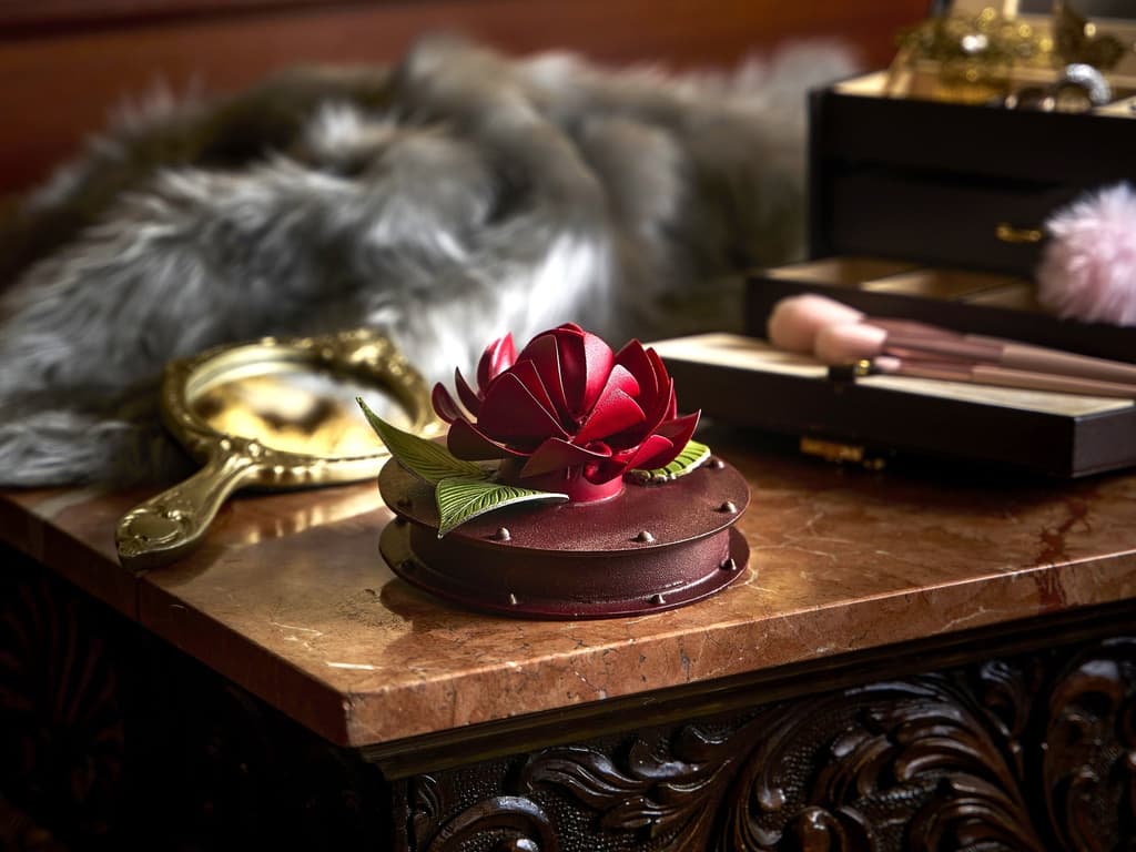 用精湛的工艺再现的深红色玫瑰,优雅地装饰在黑巧克力珠宝盒上。里面隐藏着入口即化的奶油焦糖,带来浓郁的余味。请尽情享受这艺术外观与奢华味道相遇的幸福时刻。