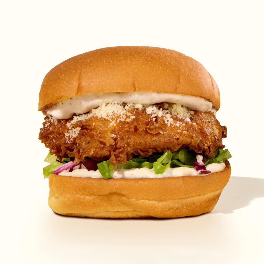 本次限定菜单的明星产品是凯撒鸡肉堡,采用新鲜炸制的鸡肉,下单后立即准备。每块鸡胸肉在下单后单独裹上面糊并炸制,以确保最佳新鲜度。汉堡中加入了自制凯撒酱、切碎的罗马生菜和菊苣,以及帕尔马干酪。