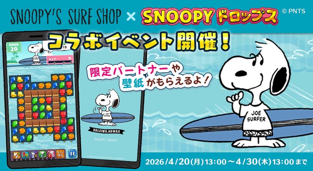 手机益智游戏《Snoopy Drops》与 Snoopy's Surf Shop 的特别联动活动现已正式启动。这是夏威夷首家官方 PEANUTS 商店 Snoopy's Surf Shop 的首次联动,JOE SURFER 史努比将会在游戏中登场。
