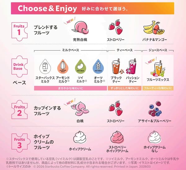 本店是冲绳第二家提供"My Fruits³ 星冰乐®"的门店,这是一款可以自由定制的冰冻水果饮品。客人可自行选择混合水果、基底、杯内水果以及奶油顶料,调制出专属饮品。在鲜度巅峰时冷冻的整颗水果直接融入基底进行混合,带来更加浓郁醇厚的果香。其理念是"尽情玩转水果"——杯底先铺满所选水果,再层层叠加混合饮料。