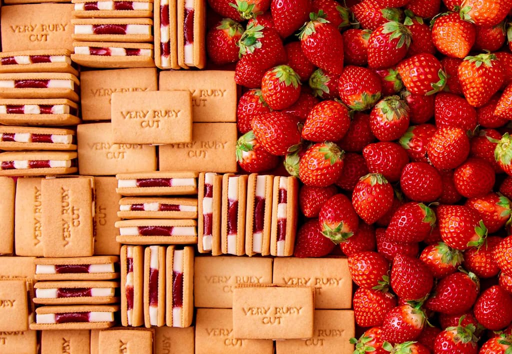 Very Ruby 礼盒汇集了招牌草莓牛奶夹心饼干、湿润多汁的甘王草莓芝士蛋糕,以及酥脆的草莓奶油派。