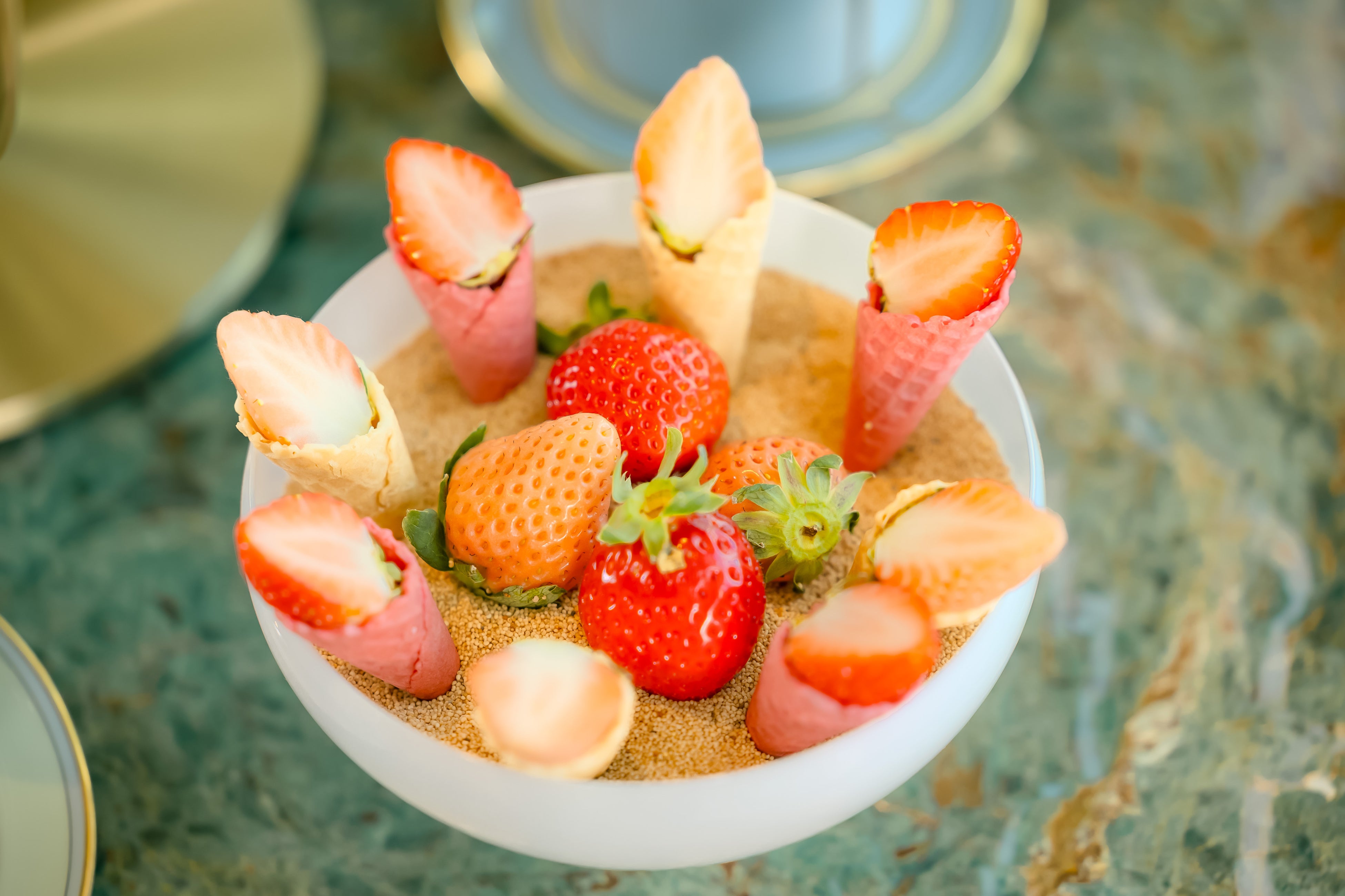 作为直接送到客人餐桌上的传递甜点,有两种“草莓小圆锥”可供选择。“白色”的特色是香草味的锥形蛋筒,配上光亮的甘纳许奶油,顶部是佐贺县“淡雪”白草莓带来的柔和甜味。 另一种选择是“红色”,它是一种草莓锥形蛋筒,里面装满了充满活力的 rhubarb 果酱,顶部是“甘王”草莓的深红色美丽。