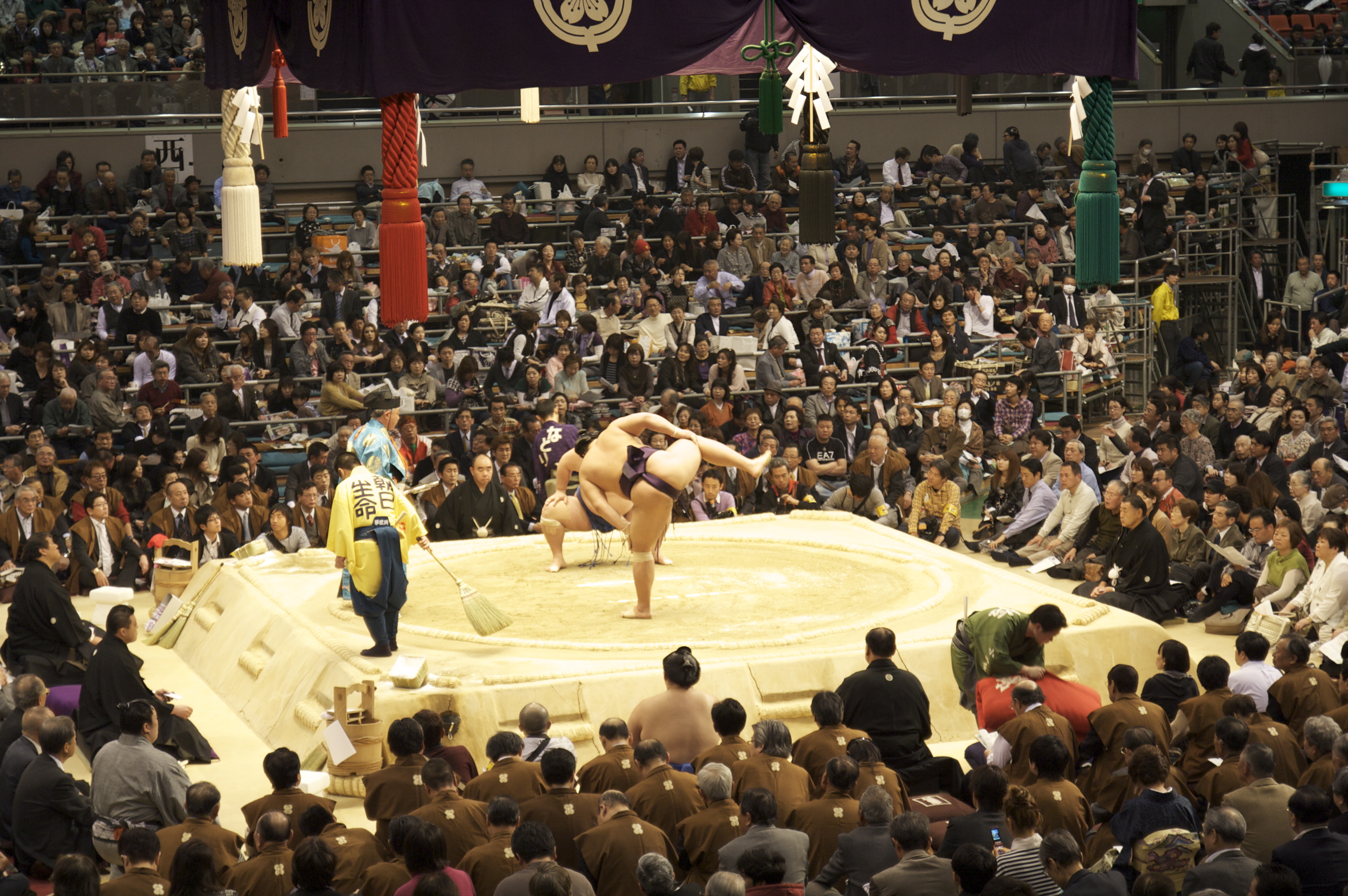 ◆ 活动介绍 东京相扑大赛(本场所)是日本最具代表性和文化意义的体育赛事之一。在日本全国每年举行的六次大赛中,有三次在东京墨田区的两国国技馆举行,展示了最高水平的相扑运动。每场比赛持续15天,从早上较低级别的比赛到下午晚些时候的精英幕内级别比赛,共有数百场比赛。现场气氛融合了激烈的体育竞技和几个世纪的神道仪式,使其成为一场真正独特的盛会。 ◆ 历史背景 相扑被认为在日本拥有至少1500年以上的历史。古代编年史《古事记》和《日本书纪》记载了关于神灵之间相扑的神话。在奈良时代和平安时代(8世纪至12世纪),相扑作为官方仪式的一部分在朝廷举行。 江户时代(1603年至1868年),相扑发展成为江户(今东京)深受庶民喜爱的城市娱乐形式。专业的相扑选手开始组织起来,许多今天可以辨认的仪式元素,包括入场仪式、裁判的传统服装和撒盐净化,都是在这个时代建立的。目前每年举行六次比赛(各15天)的制度于战后时期确立,由日本相扑协会运营管理。六场比赛中有三场在东京举行,其余三场在大阪(3月)、名古屋(7月)和福冈(11月)举行。 ◆ 东京比赛时间表 📅 1月比赛(初场所 / 新年比赛) 在1月中旬举行15天,通常从该月的第二个星期日开始。这场比赛标志着相扑历年的开始,是最受期待的赛事之一。 📅 5月比赛(夏场所 / 夏季比赛) 在5月中旬举行15天,通常从该月的第二个或第三个星期日开始。夏季比赛带来了激动人心的竞争,相扑选手们力争为今年建立势头。 📅 9月比赛(秋场所 / 秋季比赛) 在9月中旬举行15天,通常从该月的第二个星期日开始。秋季比赛是今年东京本场所的最后一场比赛。 ◆ 每日赛程 比赛在上午晚些时候开始,首先是较低级别的比赛(序之口、序二段、三段目和幕下)。十两(第二高级别)的比赛在下午中期进行,随后是备受期待的幕内(最高级别)的比赛在下午晚些时候进行。当天的最后一场比赛,被称为结びの一番,通常在下午6:00左右结束。 每场比赛的最后一天,被称为千秋楽,是高潮的结束,比赛冠军(优胜)将在此决出,并被授予著名的天皇杯以及其他众多奖品和奖杯。 ◆ 场地:两国国技馆 📍 地点:东京都墨田区横网1-3-28 🚃 交通:从JR两国站(西口)步行1分钟,或从都营大江户线两国站(A3出口)步行5分钟 两国国技馆,通常简称为国技馆(“国家体育馆”),是职业相扑的精神家园。这个标志性的室内竞技场可容纳超过10,000名观众,其中心是神圣的土俵(粘土环),顶部是一个悬挂的神社式屋顶(吊屋根),象征着相扑与神道传统的深厚联系。 座位选择包括靠近土俵的传统枡席(包厢座位),观众可以坐在榻榻米风格的私密隔间里的垫子上,以及上层的椅子座位,可以欣赏到竞技场的全景。 ◆ 相扑的特别之处 🎌 神圣仪式 相扑的方方面面都沉浸在神道传统中。摔跤手在每场比赛前撒盐以净化场地,进行仪式性的跺脚(四股)以驱赶邪灵,并参加精心制作的入场仪式(土俵入り)。横纲(大冠军)的入场仪式尤其令人敬畏地展示了传统和力量。 💪 排名 相扑选手(力士)在一个称为番付的等级系统中进行排名。相扑的顶峰是横纲的等级,即大冠军,这个头衔具有极高的声望和责任。摔跤手住在公共训练馆(部屋)里进行训练,其中许多训练馆都位于两国地区。 🍲 两国相扑文化 国技馆周围的两国地区充满了相扑文化遗产。游客可以探索供应丰盛的火锅炖菜的chanko-nabe(相扑火锅)餐厅,这是相扑选手的主要饮食,参观竞技场内的相扑博物馆,并看到力士穿着传统服装走在附近的街道上。 ◆ 重要提示 ⚠️ 本页仅供活动信息参考。有关比赛的咨询,请随时直接与我们联系。 ⚠️ 竞技场在比赛期间可能会非常拥挤,尤其是在周末和最后几天。请提前计划您的访问。 ⚠️ 摄影规则可能适用于竞技场内。请遵守场地关于相机和录音设备的指南。 ⚠️ 两国地区提供许多餐饮选择,但在比赛期间,受欢迎的chanko-nabe(相扑火锅)餐厅可能会很快客满。