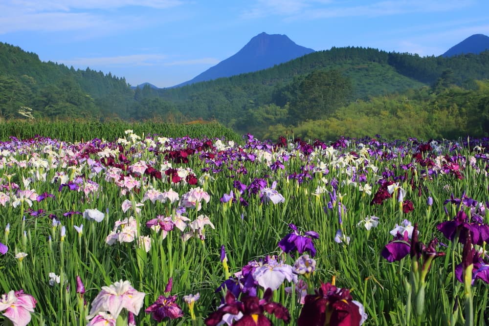 在六月初到六月底,這個位於“駕留萬”湖畔的鳶尾花園盛開著白色和紫色的鳶尾花,以“鶴見”峰為背景。擁有80個品種和15,000株鳶尾花,這個地方是在“別府”的夏天撫慰您心靈的地方。