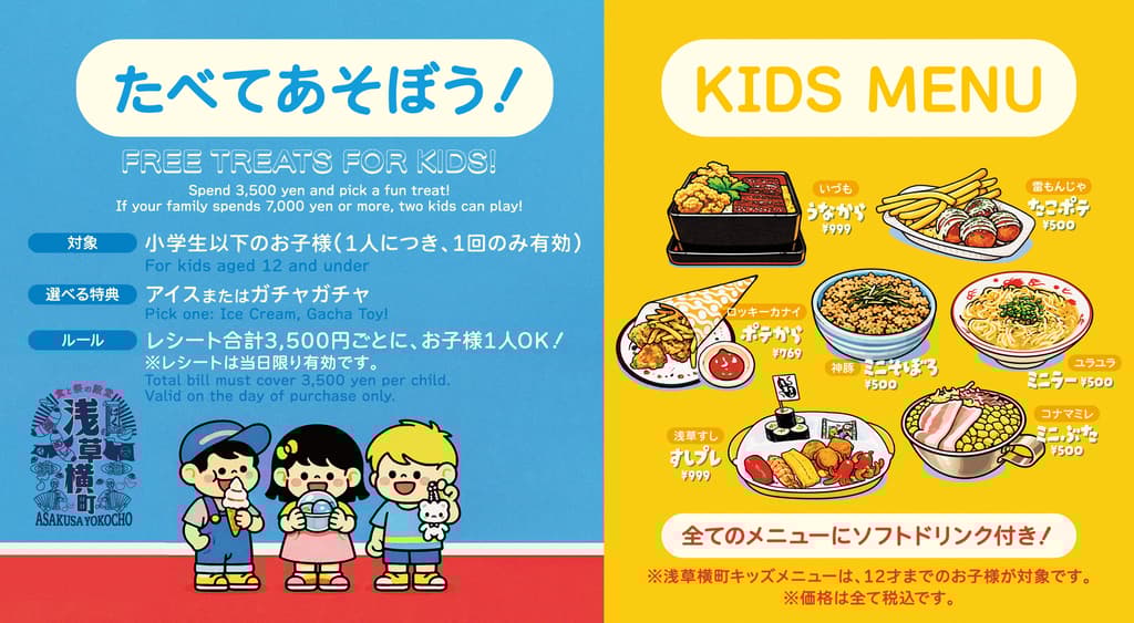 ASAKUSA YOKOCHO 是一處以祭典為主題的美食複合設施,於 2022 年在淺草開幕。這裡匯集了七間餐廳與一家和服租借店,在熱鬧的屋簷下共聚一堂。為讓攜帶幼童的家庭能更盡興地享受,場館近日新增了兒童菜單及以收據累積兌換的優惠方案。