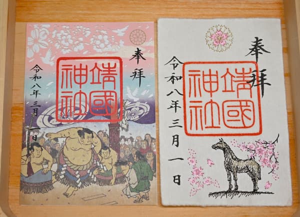 還有春季限定的剪紙和刺繡御朱印,以櫻花為主題,並結合了以相撲奉納表演和紀念在戰爭中失去的戰馬的紀念雕塑為靈感的設計。