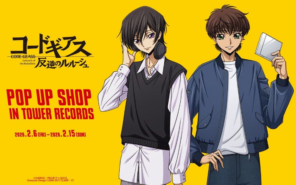 「Code Geass 反叛的魯路修」特別快閃店活動即將在 Tower Records 各店鋪登場!「Code Geass 反叛的魯路修 POP UP SHOP in Tower Records」將於 2026 年 2 月 6 日至 15 日在 Tower Records 澀谷店、Tower Records 阿倍野 Hoop 店以及 Tower Records 線上商店舉行。