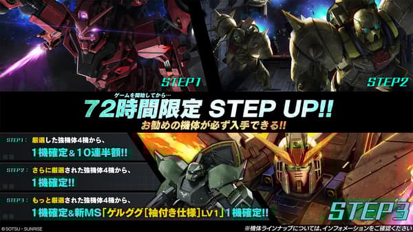 「72小時限定STEP UP轉蛋」的陣容也已更新——登入後72小時內可用。每個STEP保證獲得四架精心挑選的強大機體之一,STEP 3提供一架已確定的Gelgoog [Sleeves Specification] LV1。