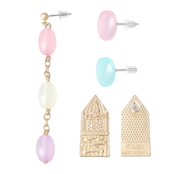 四件耳環組,包含以「伯蒂·博特每味豆」包裝為設計靈感的牌形耳環、附有繽紛豆子造型的三連垂墜耳環,以及綠色與粉色各一的光滑單石耳環。可依場合自由搭配混搭,打造不同風格造型。