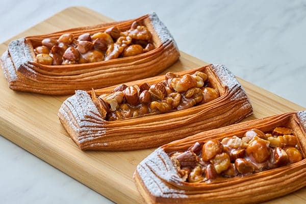 全新推出的丹麥麵包以精緻千層麵團為基底,擠上巧克力奶油,再鋪滿焦糖化的夏威夷豆、杏仁及核桃。三種堅果帶來酥脆口感,焦糖微苦的風味與層次豐富的酥皮底座相得益彰。