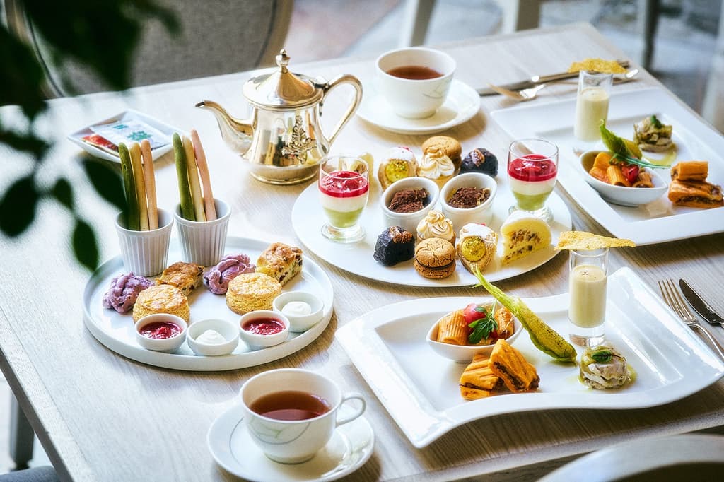 鹹食方面,冷製北海道白玉米 Zuppa(濃湯)以北海道白玉米的天然甜味為主角,搭配烤嫩玉米與帕瑪森起司脆片。另有鱸魚與烤茄子千層派,以醃製鱸魚與烤茄子層疊堆砌,口感清新爽口。
