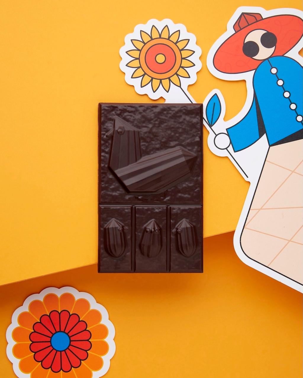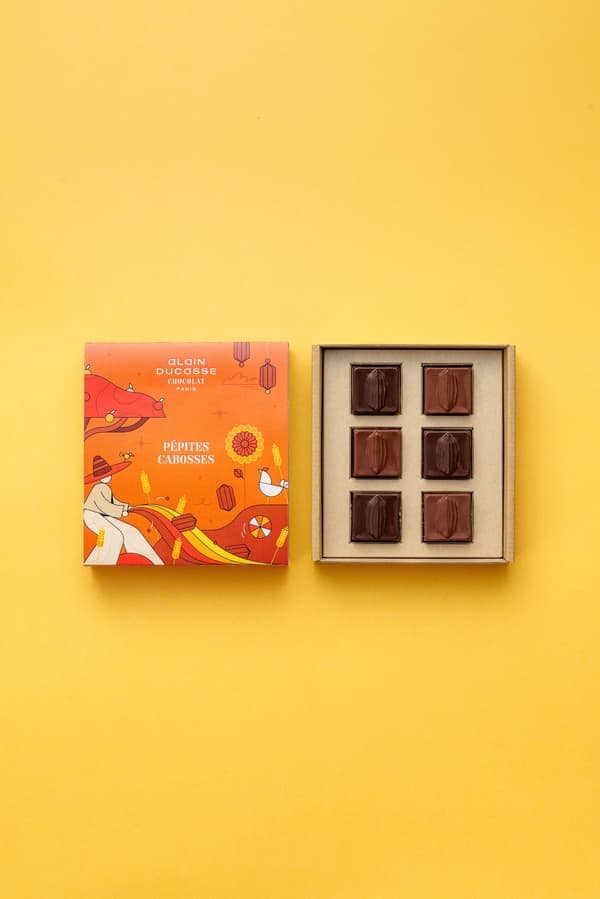 一款結合了可可豆莢和小雞設計的小巧克力,有兩種口味可供選擇:75% 黑巧克力和 45% 牛奶巧克力。