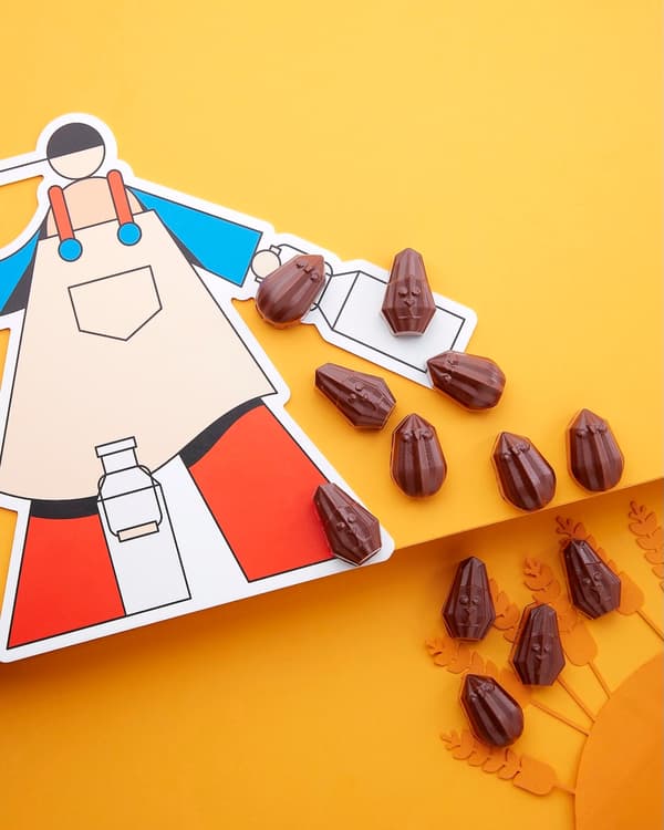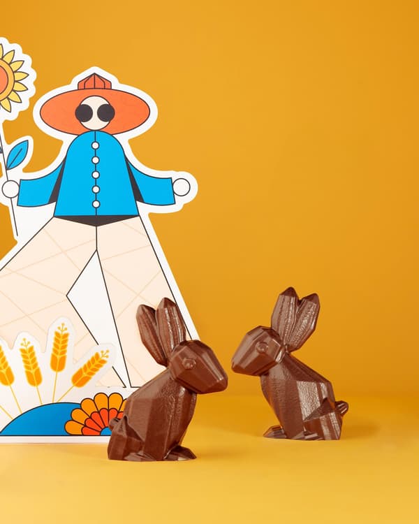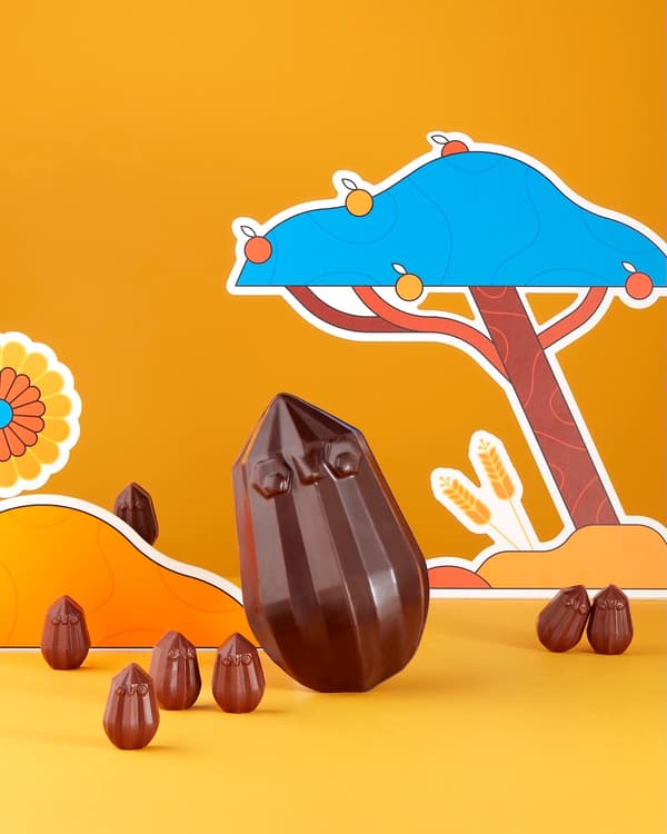 引人注目的橘色包裝出自巴黎和加拿大都備受讚譽的插畫家 Aurélien Jenny 之手。他的配色方案讓人聯想到成熟可可豆莢的活力,為復活節慶祝活動增添了生動的背景。