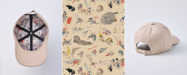 帽子內襯印有三次物怪博物館館藏之《百鬼夜行繪卷》中的妖怪圖樣。圖案位置會因個別商品而有所差異。帽子設有調節帶,適合頭圍 56–59 公分的配戴者。