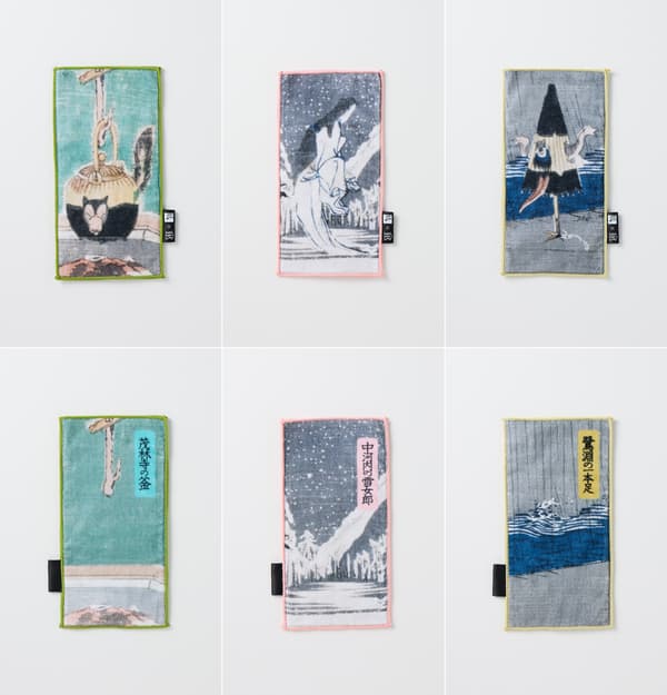 毛巾正面繪有妖怪現身的場景,反面則是妖怪消失後的景色,隱喻著妖怪雖然看不見,卻始終就在身邊。(上排,由左至右:茂林寺的茶釜、中河內的雪女、鷺內的一腳傘怪——正面。下排:同三款,反面。)