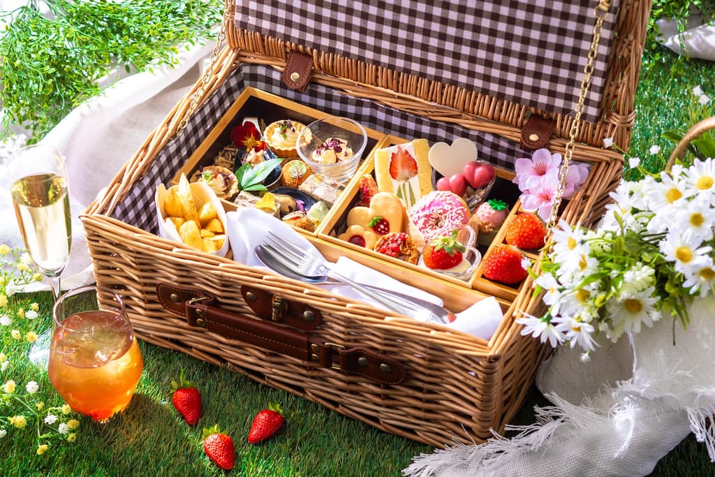草莓三明治的造型像鬱金香,其美麗的橫截面,將新鮮草莓和奇異果與蓬鬆的鮮奶油和海綿蛋糕分層。 每一口都散發著柔和的甜味和令人愉悅的口感。 其他產品包括粉紅色草莓巧克力塗層草莓甜甜圈、裝飾有微小草莓圖案的草莓果醬餅乾以及搭配大量煉乳的新鮮草莓。 酒店糕點主廚共創作了七款以時尚野餐為主題的甜點。 鹹味精選包括裝在有趣的馬鈴薯盒中的炸薯條,為籃子展示增添了異想天開的氣息。