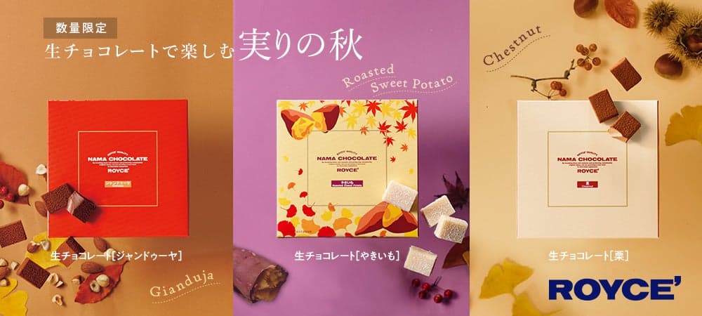 三款全新限定版生巧克力口味於 2025 年秋季上市。ROYCE' 自 2025 年 9 月 3 日起在其郵購服務和直營店提供栗子、烤地瓜(紅遙品種)和榛果口味。這些季節性美食為巧克力愛好者帶來秋天的精髓。