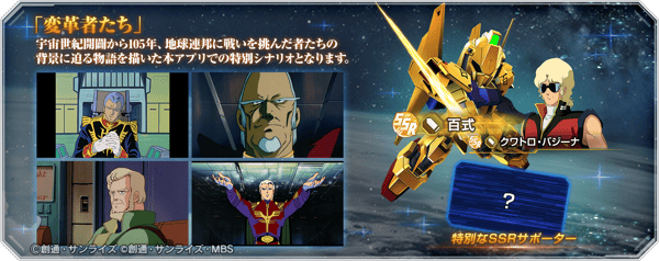 通關「革命家」可獲得SSR機體「百式」、SSR角色「克瓦特羅·巴吉納」,以及紀念目前上映中的《機動戰士鋼彈 閃光的哈薩威》瑟西的妖術的特別支援角色。