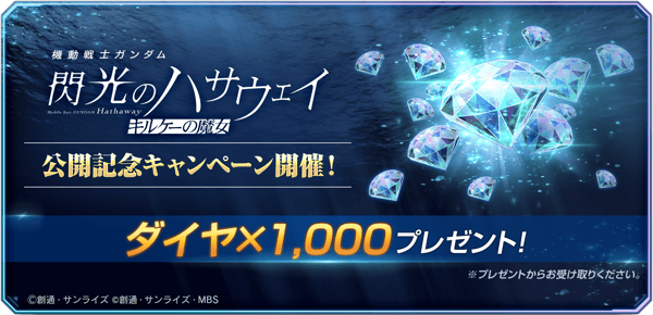 為慶祝《機動戰士鋼彈 閃光的哈薩威》瑟西的妖術上映,現正發放1,000鑽石!