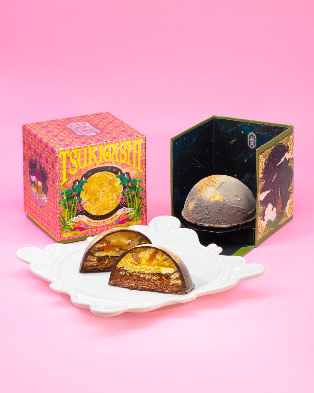 一種新推出的可食用天體,由實際的月球地形數據創建。這款充滿幻想的巧克力甜點喚起了輝夜姬的故鄉。在飾有金色雕刻的薄薄的巧克力月球表面下,是杏子甘納許、伯爵茶甘納許和切片杏仁的多層複雜排列。這款豐盛的巧克力蛋糕可供 2-3 人食用。
