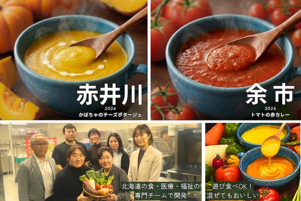 這系列湯品透過「醫療・福祉・農業・飲食」跨域合作模式開發,匯聚了北海道在醫療、農業、福祉及烹飪領域的專家。當季食材經過攪拌成泥後形成天然濃稠口感,讓有吞嚥困難的人也能充分品嚐新鮮食材的滋味。目前推出兩款口味:金黃南瓜奶油乳酪濃湯,以及使用余市番茄製作的紅咖哩。